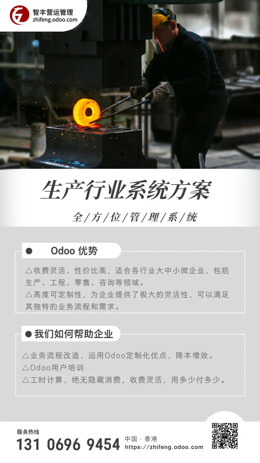 Odoo是一套集成化的软件解决方案,它覆盖了从订单接收、生产计划、物料管理、生产执行到成品出库的全过程。通过自动化和智能化手段,帮助企业实现精细化管理,提高整体运营效率。